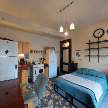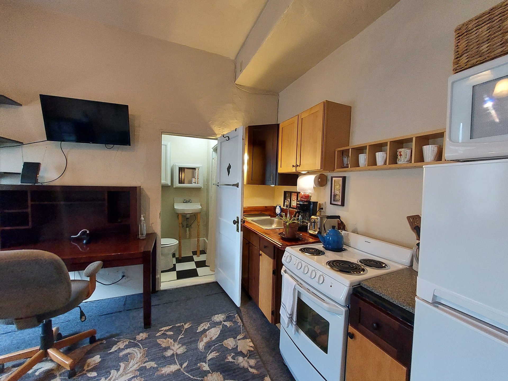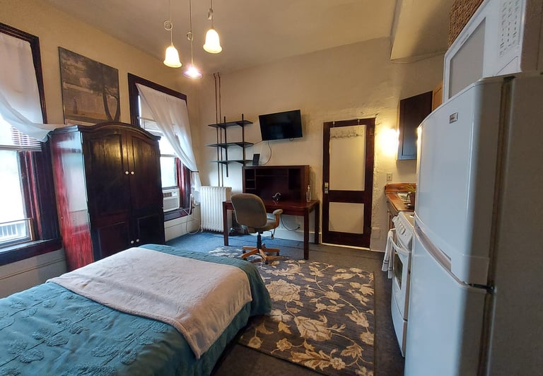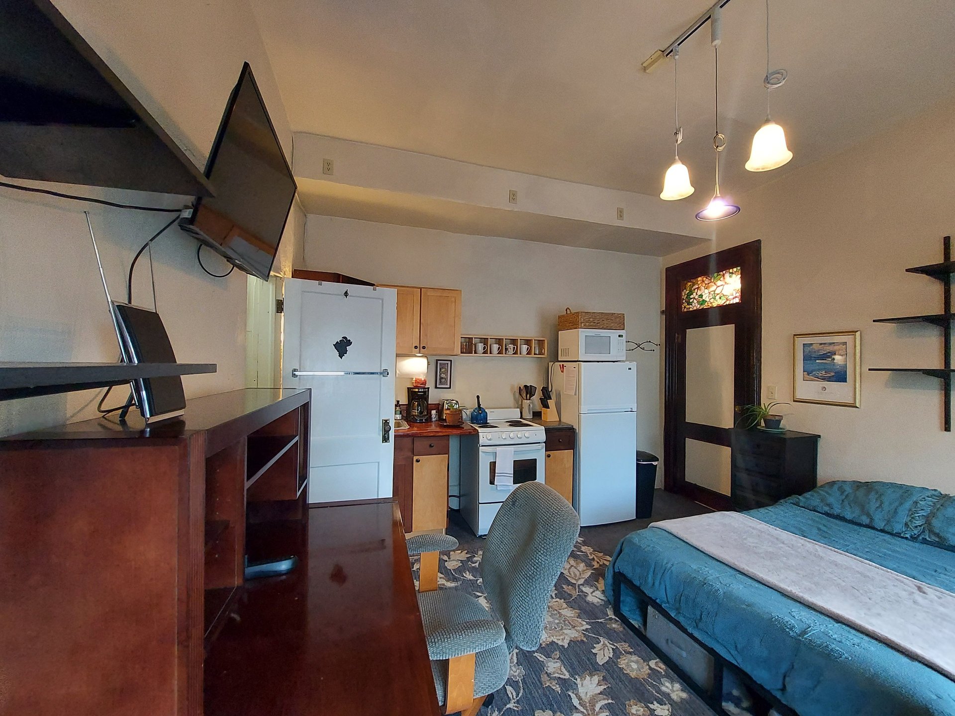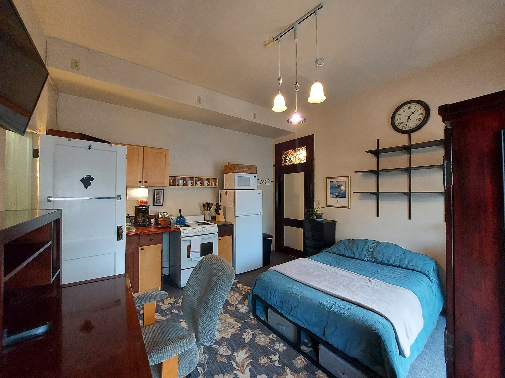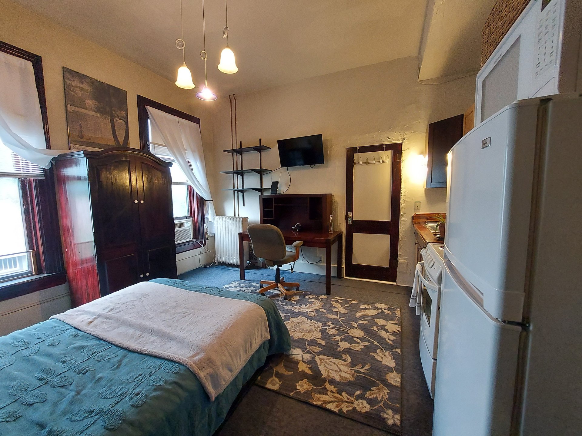 One-room studio with private bath with stall shower. Full size bed, desk, armoire for closet, and kitchen area along one wall.