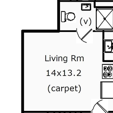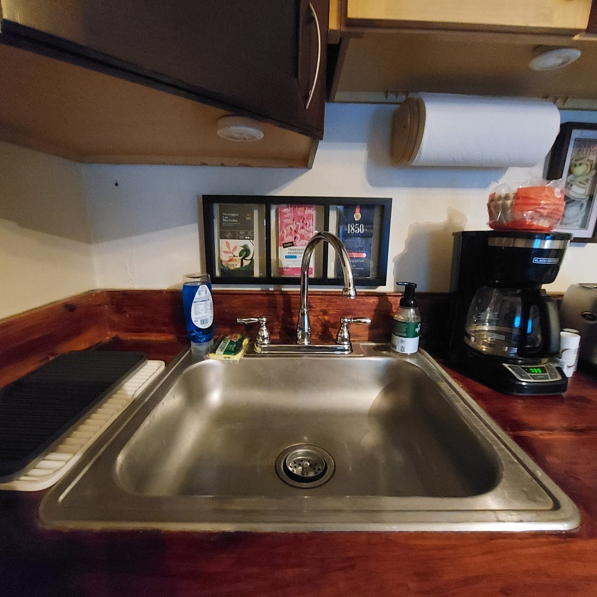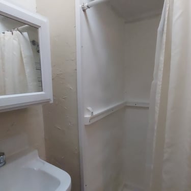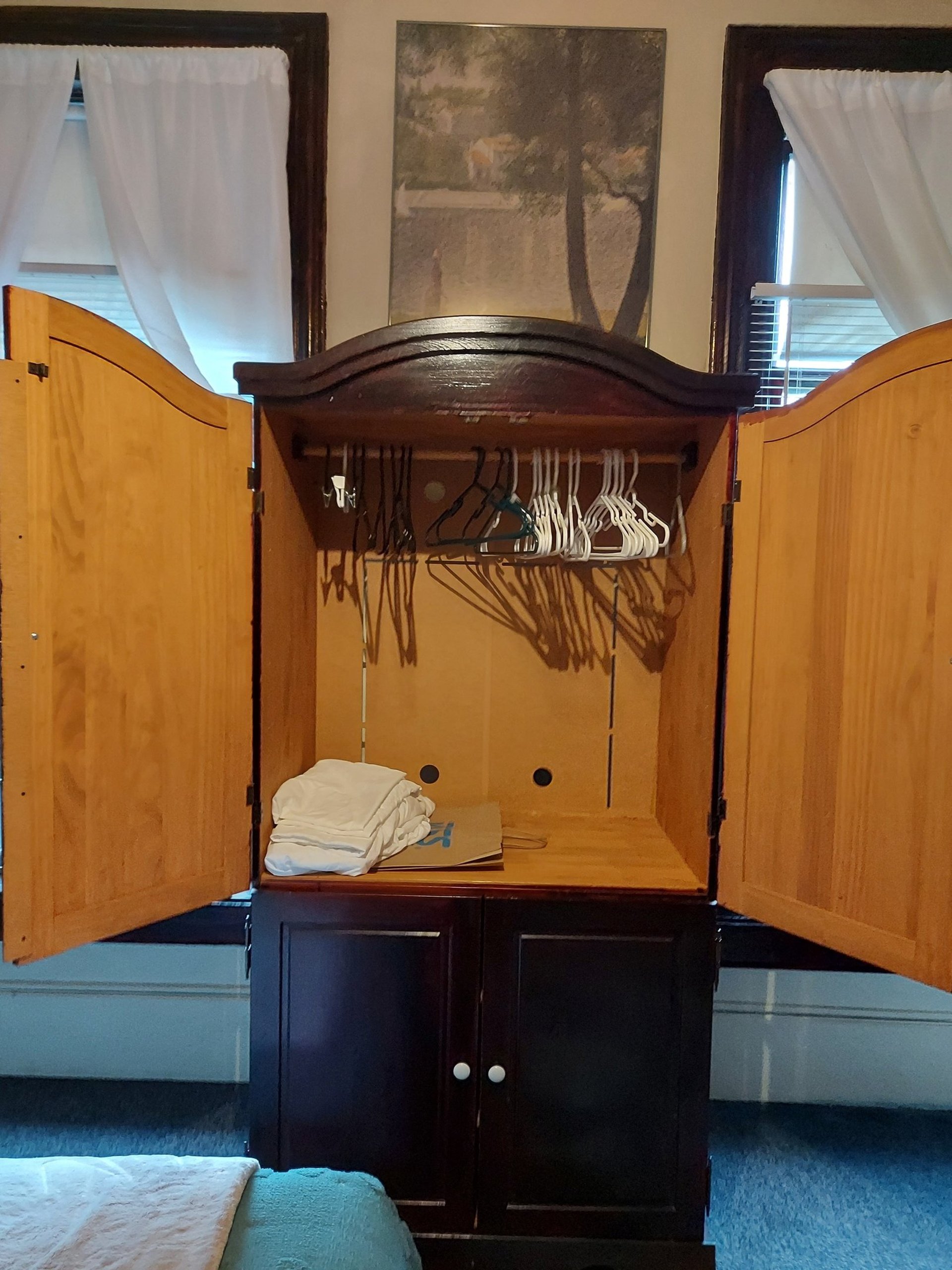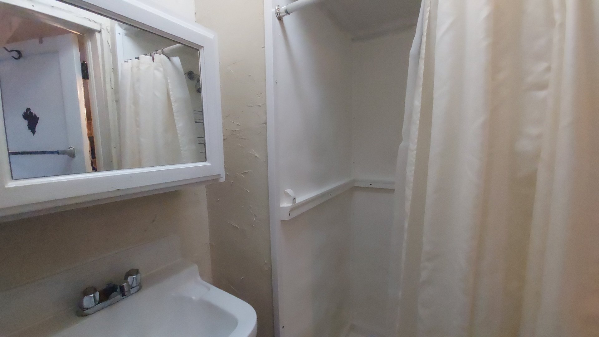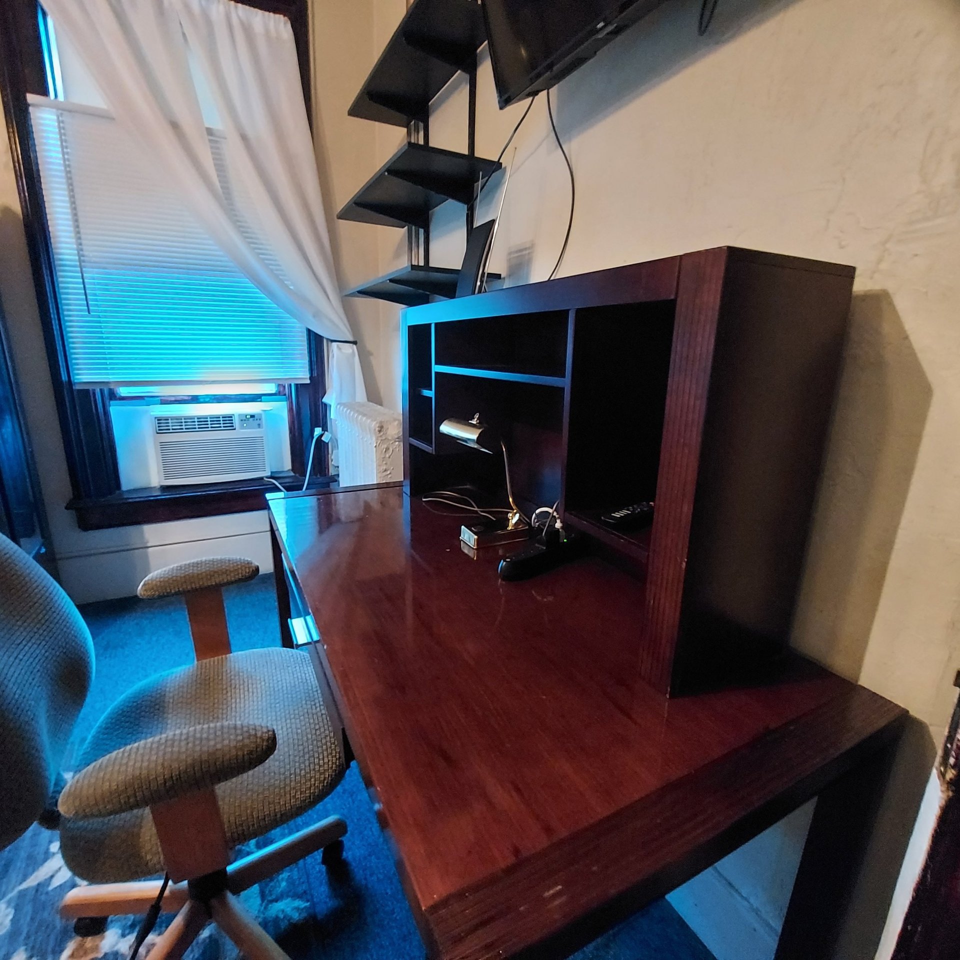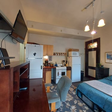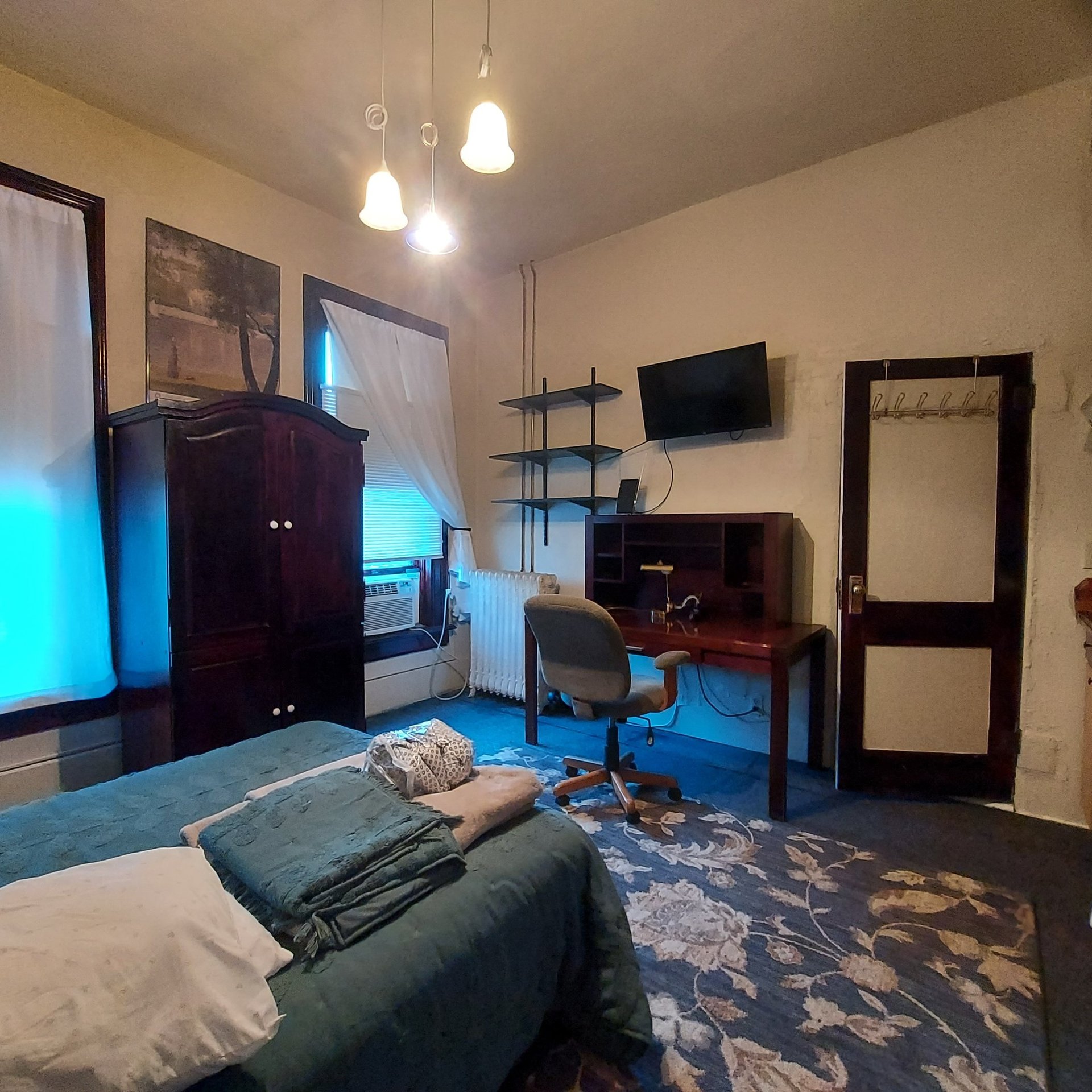 One-room studio with private bath with stall shower. Full size bed, desk, armoire for closet, and kitchen area along one wall.